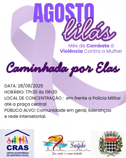 A Coordenadoria de Assistência Social em parceria com a rede intersetorial de Paulicéia, convida toda população de Paulicéia e convoca todos os Beneficiários do Bolsa família, Participantes das oficinas de Violão, Café com Prosa, Pintura em tecido, participante dos Programas e Projetos Criança Mais Feliz, Karatê, Capoeira, Banda Marcial e escolinha de Futebol, Beneficiários do Criança Feliz de Pauliceia, participantes do CCI e GRUPOS do PAIF/ CRAS para estarem presentes na 1ª Caminhada em Ação à Campanha Agosto Lilás - Violência contra a Mulher.