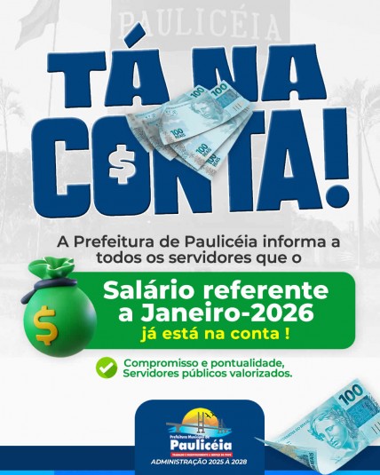A Prefeitura de Paulicéia informa que o salário referente a "Janeiro-2026" já está na conta.